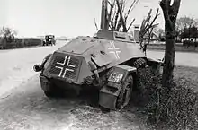 In an encounter between Danish and German forces at Bredevad, 10 km north of the border, a German vanguard of four armoured cars approached the village. The Danes arrived at 6:30 AM and, without time to build a roadblock, took cover in a garden.[17] A machine gun and a 20 mm cannon, manned by one and a half platoons, fired warning shots. When the Germans ignored this, the Danes opened fire from 300 meters out, knocking out the lead armoured car and killing its driver. A short skirmish followed. The Danes knocked out three more German armoured cars and suffered four casualties. At 07:15 a reinforcing German motorized column arrived from Tinglev, cutting off the Danes and forcing them to surrender. Two Danes were killed and five were wounded.[13]