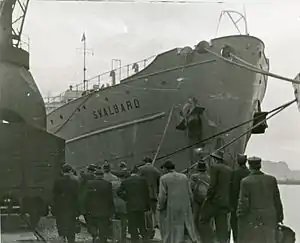 In Kiel at the end of the war, Togo was seized as war booty and transferred first to Britain on 13 August 1945, then to the US Navy on 15 January 1946, and used to repatriate Polish ex-prisoners of war. Handed over to the Royal Norwegian Navy on 14 March (and renamed HNoMS Svalbard in December 1946), she was then used as a fleet auxiliary to transport occupation troops to Germany.[2][10][22] By this time her passenger capacity had been increased to 900,[8] and between December 1947 and December 1949 she was chartered by the International Refugee Organisation for transport of Displaced Persons from Europe to North America and Australia.[10] Svalbard undertook six voyages between June 1948 and October 1949, carrying a total of 5,242 DPs for resettlement in Australia.[8][23]