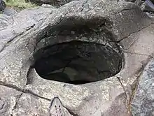 A giant's kettle, also known as either a giant's cauldron, moulin pothole, or glacial pothole, is a typically large and cylindrical pothole drilled in solid rock underlying a glacier either by water descending down a deep moulin or by gravel rotating in the bed of subglacial meltwater stream.[1]