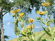 Additional species are displayed on nearby walks. The garden's nature walk displays Acer pseudoplatanus, Arundo donax, Betula pubescens, Cytisus scoparius, Fagus sylvatica, Frangula alnus, Fraxinus excelsior, Juniperus communis, Laburnum anagyroides, Lythrum salicaria, Sorbus aria, S. aucuparia, as well as Iris pseudacorus, I. sibirica, Myosotis scorpioides, Salix sp., Scirpus sylvaticus, Silphium perfoliatum, and Typha latifolia. The trail from Stresa to the Mottarone passes by Androsace vandellii, Campanula glomerata, Gentiana asclepiadea, G. kochiana, G. Kochiana, G. purpurea, Hypochoeris uniflora, Narcissus poeticus, Primula hirsuta, Rhododendron ferrugineum, Trollius europaeus, and Veratrum album.