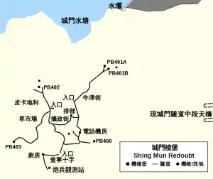 Defensive headquarters were located at Shing Mun Redoubt (Chinese: 城門棱堡 or 城門碉堡) – also known as the "Strand Palace Hotel" – which had an observation post (acting as headquarters of the redoubt) that could call artillery support from Mount Davis battery and Stonecutters Island Fort, and four pillboxes (PB400-403) fitted with Vickers machine guns and Bren LMGs. There were 1.5 metre deep defensive channels or trenches, named after the roads of London such as Charing Cross, to aid the British soldiers of the Middlesex Regiment.