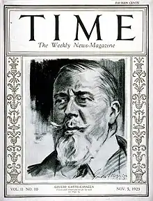 For his accomplishments Gatti-Casazza was one of the first Italians (and the first Italian living in the United States) to be featured on the cover of Time Magazine. He was on the weekly's cover twice; on 5 November 1923, and again on 1 November 1926.[2]