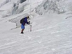 To determine mass balance in the accumulation zone, snowpack depth is measured using probing, snowpits or crevasse stratigraphy. Crevasse stratigraphy makes use of annual layers revealed on the wall of a crevasse.[13] Akin to tree rings, these layers are due to summer dust deposition and other seasonal effects. The advantage of crevasse stratigraphy is that it provides a two-dimensional measurement of the snowpack layer, not a point measurement. It is also usable in depths where probing or snowpits are not feasible. In temperate glaciers, the insertion resistance of a probe increases abruptly when its tip reaches ice that was formed the previous year. The probe depth is a measure of the net accumulation above that layer. Snowpits dug through the past winters residual snowpack are used to determine the snowpack depth and density. The snowpack's mass balance is the product of density and depth. Regardless of depth measurement technique the observed depth is multiplied by the snowpack density to determine the accumulation in water equivalent. It is necessary to measure the density in the spring as snowpack density varies. Measurement of snowpack density completed at the end of the ablation season yield consistent values for a particular area on temperate alpine glaciers and need not be measured every year. In the ablation zone, ablation measurements are made using stakes inserted vertically into the glacier either at the end of the previous melt season or the beginning of the current one. The length of stake exposed by melting ice is measured at the end of the melt (ablation) season. Most stakes must be replaced each year or even midway through the summer.