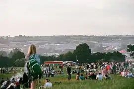 The festival takes place in South West England at Worthy Farm between the small villages of Pilton and Pylle in Somerset, six miles east of Glastonbury, overlooked by the Glastonbury Tor in the "Vale of Avalon".[171] The area has a number of legends and spiritual traditions, and is a "New Age" site of interest: ley lines are considered to converge on the Tor.[172] The nearest town to the festival site is Shepton Mallet, three miles (5 km) north east, but there continues to be interaction between the people espousing alternative lifestyles living in Glastonbury and the festival. The farm is situated between the A361 and A37 roads.
