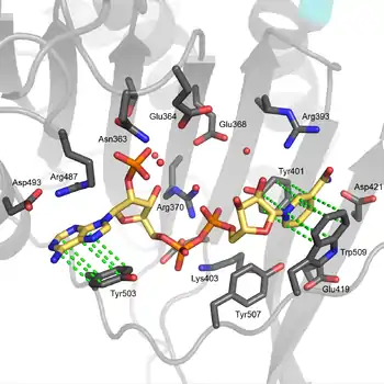 The structural site has been shown to be important for maintaining the long term stability of the enzyme.[12] More than 40 severe class I mutations involve mutations near the structural site, thus affecting the long term stability of these enzymes in the body, ultimately resulting in G6PD deficiency.[12] For example, two severe class I mutations, G488S and G488V, drastically increase the dissociation constant between NADP+ and the structural site by a factor of 7 to 13. With the proximity of residue 488 to Arg487, it is thought that a mutation at position 488 could affect the positioning of Arg487 relative to NADP+,[12] and thus disrupt binding.