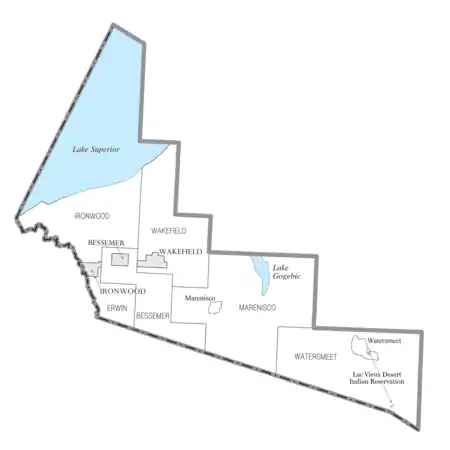 Gogebic County (/ɡoʊˈɡɪbɪk/ goh-GHIB-ik) is the westernmost county in the Upper Peninsula in the U.S. state of Michigan. As of the 2010 census, the population was 16,427.[2] The county seat is Bessemer.[3] This was historically part of the territory of the Lake Superior Band of Chippewa, which had twelve bands in Michigan, Wisconsin and Minnesota. The Lac Vieux Desert Indian Reservation is in this county, in Watersmeet Township; it is the land base of one of the federally recognized tribes.