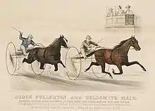 Goldsmith, believing that the 11-year-old mare was nearing the end of her career, sold her to Budd Doble, a popular harness racer and trainer, in 1868 for $20,000. Goldsmith Maid raced for another six years for Doble, notably winning races in Buffalo, Sacramento, and East Saginaw, Michigan, against male contenders half her age.[1] From 1869 to 1874, Goldsmith Maid became immensely popular with the American public, attracting thousands of spectators to special match races that pitted her against the nation's top harness racers.[2] Doble earned so much from these matches and the horse had become so popular that "The Maid" traveled to these engagements in her own private railroad car.[3] In 1871 Goldsmith Maid first broke the trotters mile record by recording a mile of 2.17 in a match against Lucy in Milwaukee.[4] She lowered the record again in 1872. In 1874, Doble set a harness racing world record (one mile in 2:14) in Boston with Goldsmith Maid, who was by then 17 years old[1] after having lowered the record twice at Saginaw and at Buffalo and Rochester earlier in the year.[5]