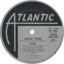The song hit number-one on August 18, 1979 before being ousted by The Knack's smash hit "My Sharona" the following week.[3] Along with the songs "My Forbidden Lover" and "My Feet Keep Dancing", "Good Times" reached #3 on the disco chart.[4] It reportedly sold more than 5 million copies, making it, at the time, the best-selling 45 rpm single in the history of Atlantic Records.[5] Billboard magazine named "Good Times" the number one soul single of 1979.