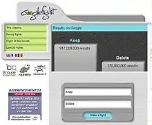 Googlefight is a website that outputs a comparison of the number of search results returned by Google for two queries, presented as the result of a fight.