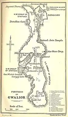 The number of Jain rock shrines at Gwalior, with numerous monumental statues, is unmatched anywhere else. James Burgess writes: "In the 15th century, during the reign of the Tomara Rajas, the Jains seem to have been seized with an uncontrollable impulse to convert the cliff that sustains the fort into a great shrine in honour of their religion, and in a few years excavated the most extensive series of Jaina caves known to exist anywhere."[1]