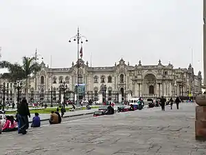 The Government Palace (Spanish: Palacio de Gobierno), also known as the House of Pizarro, is the seat of the executive branch of the Peruvian Government, and the official residence of the President of Peru.[1] The palace is a stately government building, occupying the northern side of the Plaza Mayor in Peru's capital city, Lima. Set on the Rímac River, the palace occupies the site of a very large huaca ("revered object") that incorporated a shrine to Taulichusco, the last kuraka (indigenous governor) of Lima.