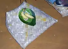 An offering of baagina occurs during the festival. At least five baaginas are prepared as part of the vratha. Each baagina usually contains a packet of arshina (turmeric), kumkum, black bangles, black beads (used in the mangalsutra), a comb, a small mirror, baLe bicchoLe, coconut, blouse piece, dhaanya (cereal), rice, toor dal, green dal, wheat or rava and jaggery cut in a cube form. The baagina is offered in a traditional mora (winnow painted with turmeric). One such baagina is offered to Gowri and set aside. The remaining Gowri baaginas are given to the married women.[2][5]