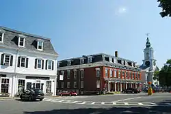 The Grafton Common Historic District encompasses the historic village center of Grafton, Massachusetts. The center consists of a number of buildings arrayed around a roughly oval common, which were mostly built in the middle of the 19th century. Later development was significantly reduced because the area was bypassed by the railroads. The common was laid out in 1728, when the area was first settled by colonists, and is enclosed by an 1845 fence built out of granite posts and wooden rails. Prominent buildings surrounding the common include the 1863 Italianate Unitarian Church, the 1833 Greek Revival Congregational Church, and the 1805 Federal style Grafton Inn.[2]