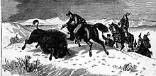 From there the train continued to Denver where Alexei arrived on 17 January. While in Denver, he attended an honorary ball sponsored by the Pioneer Club and visited some mines. He apparently loved the new sport he had just learned and hunted buffalo again near Colorado Springs, on his return trip from Denver through Kansas to St. Louis. However, the horses used to hunt in eastern Colorado were cavalry mounts and unaccustomed to buffalo; several hunters were injured during the resulting confusion. Alexei was unhurt and succeeded in killing as many as 25 buffalo. He even shot a few more from the train on its way across western Kansas toward Topeka, which was reached on 22 January.[51] It is claimed that, by the time they reached St. Louis, the party's supply of caviar and champagne had been exhausted.[49][52][53][54][55][56][57]