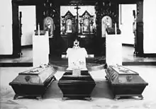After the autopsies were performed, the bodies of the Romanovs were washed, dressed in white shrouds, and placed in wooden coffins.[30] There was a funeral service for them on 19 October when the coffins were placed in the crypt of the cathedral of the Holy Trinity in Alapayevsk where they remained until July 1919. Then, as Alapayevsk, was about to be retaken by the Red Army, the coffins were moved to Irkutsk.[30] There the coffins rested for less than six months, before the advance of the Red army forced their removal eastward. Early in 1920, the coffins with the remains of Grand Duke Sergei and those killed with him, were taken out of Russia by train through Harbin. By April 1920 the coffins were in Beijing, where they were placed in the crypt of the chapel attached to the Russian Mission. They remained there until 1957 when they were buried at the Russian Orthodox cemetery as the chapel was demolished. The government of the USSR did not have any interest in the preservation of the Russian cemetery in Beijing and in the late 1980s the Chinese authorities converted it into a park. It is believed that the coffins are still in place, now buried beneath a parking area.[30] After the Communist regime collapsed, the mineshaft where the Grand Duke was killed with his relatives became a site of religious pilgrimage and an orthodox chapel was built there.