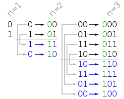 The binary-reflected Gray code list for n bits can be generated recursively from the list for n − 1 bits by reflecting the list (i.e. listing the entries in reverse order), prefixing the entries in the original list with a binary 0, prefixing the entries in the reflected list with a binary 1, and then concatenating the original list with the reversed list.[12] For example, generating the n = 3 list from the n = 2 list: