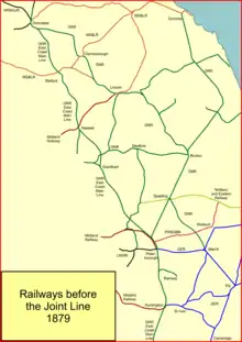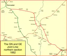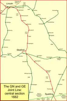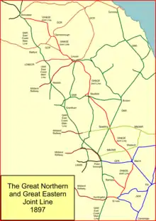 The Great Northern and Great Eastern Joint Railway, colloquially referred to as "the Joint Line"[1] was a railway line connecting Doncaster and Lincoln with March and Huntingdon in the eastern counties of England. It was owned jointly by the Great Northern Railway and the Great Eastern Railway. It was formed by transferring certain route sections from the parent companies, and by the construction of a new route between Spalding and Lincoln, and a number of short spurs and connections. It was controlled by a Joint Committee, and the owning companies operated their own trains with their own rolling stock. The Joint Line amounted to nearly 123 miles of route.