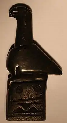 The most important artefacts recovered from the Monument are the eight Zimbabwe Birds. These were carved from a micaceous schist (soapstone) on the tops of monoliths the height of a person.[23] Slots in a platform in the Eastern Enclosure of the Hill Complex appear designed to hold the monoliths with the Zimbabwe birds, but as they were not found in situ it cannot be determined which monolith and bird were where.[24] Other artefacts include soapstone figurines (one of which is in the British Museum[25]), pottery, iron gongs, elaborately worked ivory, iron and copper wire, iron hoes, bronze spearheads, copper ingots and crucibles, and gold beads, bracelets, pendants and sheaths.[26][27] Glass beads and porcelain from China and Persia[28] among other foreign artefacts were also found, attesting the international trade linkages of the Kingdom. In the extensive stone ruins of the great city, which still remain today, include eight, monolithic birds carved in soapstone. It is thought that they represent the bateleur eagle- a good omen, protective spirit and messenger of the gods in Shona culture.[29]