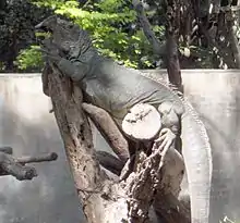 Green iguanas are considered an invasive species in South Florida and along the gulf coast of Florida from Key West to Pinellas County.[9] Over the years escaped and intentionally released iguanas from the pet trade survived and then thrived in their new habitat.[10] They commonly hide in the attics of houses and on beaches and destroy gardens and landscaping.[11] As reptiles can carry salmonella and other bacteria, combined with destruction of fragile native threatened and endangered species and habitats in the unique environment of the Florida Keys, many advocate for legislation to regulate the trade in iguanas and advocate their eradication in the wild.