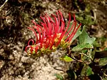 Grevillea infecunda, commonly known as Anglesea grevillea, is a root-suckering shrub which is endemic to Victoria, Australia.[2] It grows to 0.3 to 1.2 metres in height. The flowers are yellowish-green, ageing to orange-red.[2] These appear between October and December (mid spring to early summer) in its native range.[2]