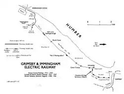 To facilitate construction of the docks the GDLR was initially built from the Grimsby direction as a contractors’ railway and the GCR ran a steam-hauled workmen's service on this from 3 January 1910.[3] The GCR had two reasons for proposing an electric tramway in addition to this light railway. (Legally the G&IER would form part of the GDLR, although there was no physical connection between them). They had developed a major power generating plant at the Docks, which used electricity extensively for crane and lock operation. This could economically supply the tramway, and did so until 1957. Secondly they envisaged on-street operation in Grimsby itself, extending the area served and facilitating direct connexion with the existing Grimsby and Cleethorpes tramways. The GCR's 1906 light railway order included a 1½ mile street tramway between Corporation Bridge and Cleveland Bridge in Grimsby, and a private right-of way alongside the existing GDLR between Cleveland Bridge and Immingham Dock.[1]