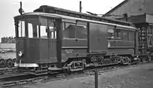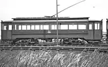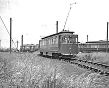 The sheds were formally known as "Cleveland Bridge Works"[20] but rarely so in practice, gaining the name "Pyewipe" from nearby marshes and road on the edge of Grimsby. They serviced all the trams.[21] They did not house the cars,[22][23][24] which, unusually for British trams, spent all their life outdoors, only entering the workshop when repairs were needed.[25] The workshop had the capacity to hold three trams on two tracks. It also housed a machine shop, paint shop and store. Until 1940 cars were periodically sent to Dukinfield carriage works for major repair. The second-hand Gateshead cars (see below) were overhauled at York before entering service.[26] The G&IER had no physical connection with the national network apart from a right-angled flat crossing with a siding near Corporation Bridge which was unusable for interchange traffic. The line closed long before the days when putting a tram on the back of a low-loader to take it to Manchester would be normal. When heavy repairs were needed or new trams were delivered they were craned between tramway metals and the GDLR which ran past the shed.[27]