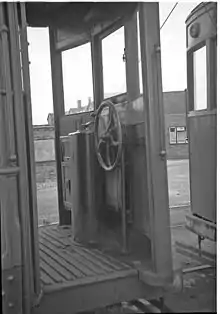 The railway was not signalled, unlike many other single-track tramways, although local signals were introduced after the Second World War at two level crossings.[54] The track on street sections in Grimsby and at Immingham used conventional grooved tramway rail; the private track sections were originally laid with flat-bottomed rail, replaced later by railway-pattern bullhead rail, and the pointwork required a different wheel profile from that normally used on tramways.[55][29]