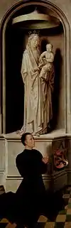 Giotto used grisaille in the lower registers of his frescoes in the Scrovegni Chapel in Padua (c. 1304) and Robert Campin, Jan van Eyck and their successors painted grisaille figures on the outsides of the wings of triptychs, including the Ghent Altarpiece. Originally these were the sides on display for most of the time, as the doors were normally kept closed except on feast days or at the (paid) request of tourists. However today these images are often invisible in museums when the tryptych is displayed open and flat against a wall. In these cases imitation of sculpture was intended; sculpture was still more expensive than a painting - even one by an acknowledged master.