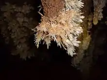 In 1825, during the construction of the D673 road from Saint-Céré to Rocamadour, the entrance to an unknown cave complex was found. It contains some great halls with very high stalactites, up to 10m, and different kind of colourful calcite deposits. It was opened to the public in 1922. Some 350m of caves can be visited. In 2011, new caves were discovered, adding some 200m to the length of the caves, and containing further large halls of up to 25m diameter and 8m high.[1]