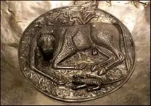 The decorated medallion on the circular base plate depicts a bull. Above the back of the bull is a female figure wielding a sword; three dogs are also portrayed, one over the bull's head and another under its hooves. Presumably all of these figures are in combat; the third dog beneath the bull and near its tail seems to be dead, and is only faintly shown in engraving, and the bull may have been brought down. Below the bull is scrolling ivy that draws from classical Greco-Roman art.[15] The horns of the bull are missing, but there is a hole right through the head where they were originally fitted; they were perhaps gold. The head of the bull rises entirely clear of the plate, and the medallion is considered the most accomplished part of the cauldron in technical and artistic terms.[16]