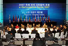 An "e-government" system based on this hosted the international e-participation forum[2] on February 7–9, 2007, with the participation of more than thirty-seven countries. The forum was launched with the theme "Promoting Democracy and Regional Development" and twenty-five mayors including André Santini (Issy-les-Moulineaux, France), Kevin Foy (Chapel Hill, US), Apirak Kosayothin (Bangkok, Thailand), Uvais Mohamed Emthiyas (Colombo, Sri Lanka), and world experts such as Dr William H. Dutton (Director of Oxford Internet Institute at the University of Oxford, UK) and Dr Ari-Veiko Anttiroiko (professor at the University of Tampere, Finland) participated in the forum. The Guro Declaration,[3] adopted during the forum, aims to set up a portal site for e-government development and to establish a concrete project in order to bridge the digital divide among the world's cities. This practice has been recognised for providing a new important step in the development of e-democracy.