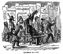The universal mode of observance through all part of England is the dressing up of a scarecrow figure in such cast-habiliments as can be procured (the head-piece, generally a paper-cap, painted and knotted with paper strips in imitation of ribbons), parading it in a chair through the streets, and at nightfall burning it with great solemnity in a huge bonfire ...[4]