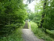 The artificial part of the hill can be scaled via stone steps that lead up to a memorial stone over four fallen resistance members who received allied airdropped weapons at the hill during World War II.[3]