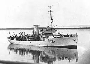 Flower-class corvettes like Lunenburg serving with the Royal Canadian Navy during the Second World War were different from earlier and more traditional sail-driven corvettes.[4][5][6] The "corvette" designation was created by the French as a class of small warships; the Royal Navy borrowed the term for a period but discontinued its use in 1877.[7] During the hurried preparations for war in the late 1930s, Winston Churchill reactivated the corvette class, needing a name for smaller ships used in an escort capacity, in this case based on a whaling ship design.[8] The generic name "flower" was used to designate the class of these ships, which – in the Royal Navy – were named after flowering plants.[9]