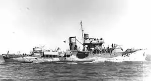Ville de Québec was paid off 6 July 1945 at Sorel, Quebec. She was transferred to the War Assets Corporation and sold for mercantile use in 1946.[11] She reappeared in 1946 as Dispina and renamed Doreathea Paxos in 1947. In 1948 she was renamed again as Tanya and then in 1949, Medex. She last appeared on Lloyd's Register in 1952.[10] The ship was laid up at Marseilles before being broken up at La Seyne beginning on 22 January 1952.[12]