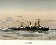 She was commissioned at Chatham by Captain Frank Hannam Henderson on 2 January 1901 with a complement of 593 men,[3] to serve at the China station to support the British position during the Boxer Rebellion.[4][5] In June 1902 she visited Nagasaki,[6] and the following month Captain Frederick George Stopford was appointed in command.[7]
