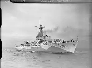 The Castle-class ships were equipped with a single QF 4-inch (102 mm) Mk XVI gun forward, but their primary weapon was their single three-barrel Squid anti-submarine mortar. This was backed up by one depth charge rail and two throwers for 15 depth charges. The ships were fitted with two twin and a pair of single mounts for 20-millimetre (0.8 in) Oerlikon light AA guns.[2] Provision was made for a further four single mounts if needed. They were equipped with Type 145Q and Type 147B ASDIC sets to detect submarines by reflections from sound waves beamed into the water. A Type 277 search radar and a HF/DF radio direction finder rounded out the Castles' sensor suite.[3]