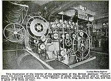 Tartar was 274 feet 3 inches (83.59 m) long overall and 270 feet 0 inches (82.30 m) between perpendiculars, with a beam of 26 feet 0 inches (7.92 m) and a draught of 8 feet 4 inches (2.54 m). Displacement was 870 long tons (880 t) normal and 960 long tons (980 t) deep load.[4] Tartar had a turtleback forecastle, but with a raised bow compared with Mohawk (also fitted with a turtleback forecastle), thus avoiding the seakeeping problems that forced Mohawk to be rebuilt with a raised forecastle.[5] Six Thornycroft boilers (in three boiler rooms) fed steam to turbines driving three propeller shafts. The main high-pressure turbine drove the centre shaft, with the outer shafts being fitted with low-pressure turbines, together with cruise and astern turbines. Four funnels were fitted.[1][6] The ship's machinery was rated at 14,500 shaft horsepower (10,800 kW). The ship had a complement of 74 officers and ratings.[4]