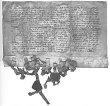 In 1349, the Black Death was brought to Bergen on board an English merchant ship to devastating effects, killing between 50% and 60% of the population,[46] leaving the kingdom in a period of social and economic decline.[47] The kingdom's financial framework (which was originally weak) virtually collapsed as the plague ravaged through the realm, and the aggressive foreign policies of Haakon would in addition take a heavy toll on the kingdom's decaying economy.[9][47][48][49] In 1371, Haakon acquired the release of his father from German imprisonment against a large ransom sum of 12,000 silver marks, which alone was more than the kingdom's ordinary tax incomes just before the outbreak of the plague. A special tax had to be imposed on Haakon's subjects to pay for the ransom.[50] In 1379, Haakon resolved the succession dispute over the Earldom of Orkney, a Norwegian dignity located within the Kingdom of Scotland. On 2 August the same year, at Marstrand near Tønsberg, Haakon invested and confirmed the title of Earl of Orkney upon Henry Sinclair, Baron of Roslin (a grandson of Maol Íosa V, Earl of Strathearn) over the rival claim of Sinclair's cousin, Malise Sparre. In return, Sinclair pledged to pay a sum of 1000 nobles before 11 November the same year, and when called upon, was to serve the Norwegian king on Orkney or elsewhere with 100 equipped and armed men for up to three months. As a security for upholding this arrangement, Sinclair had to leave behind valued hostages when he departed for his earldom. It is unknown if Haakon ever attempted to call upon the forces pledged by Sinclair, or if the agreed sum was ever actually paid in full. Shortly before his death in 1380, Haakon permitted the hostages to return home.[49][51][52] Furthermore, throughout Haakon's reign he reportedly had an unproblematic relationship with the church. Also, throughout his rule, especially after the loss of Sweden to the Germans, a noticeable number of Swedish noblemen pledged their support to Haakon and settled on Norwegian lands. The generally accepted reason was because of their displeasure towards the German usurper and his favoritism towards his own kinsmen.[49] Curiously enough, German noblemen from Mecklenburg reportedly entered the service of Haakon during his reign.[3]