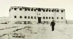 The camp was never finished, and its structures were looted in 1941. As a result, it was in poor shape when the first prisoners arrived, and the situation would deteriorate further in the months to come, when the camp came under German control.[8] The camp had a roughly rectangular shape, surrounded by a triple barbed wire fence, with guard towers at every 200 m. The camp's gate was on the western side of the fence. Most buildings were clustered on the northern half of the camp.[9] Blocks 1 to 4 were located there, built in a staggered line towards the East. These were two-storey barracks buildings, divided in two equal but separate sections, western and eastern, with separate entrances to each.[9] In addition, the north-eastern corner housed storage houses, the mess hall, the baths (Block 16), where the women's solitary confinement cells were also located, the workshops (Block 21) and the camp headquarters (Block 20). The infamous Block 15, located to the east of the headquarters, was the solitary confinement facility, with the camp guard's quarters and mess room.[9] In the south-eastern corner there was the isolated women's wing (Block 6). Under the Germans, the first floor housed Jewish women, while the second floor was reserved for Christians.[9] In total, over 300 Christian and 2,500 Jewish women passed through Haidari beginning on 7 December 1943, including heroines of the Resistance such as Iro Konstantopoulou or Lela Karagianni (executed on 5 and 8 September 1944 respectively).[10]