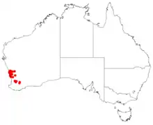 Hakea anadenia has a scattered distribution and is endemic to an area in the Wheatbelt region of Western Australia from around Dandaragan in the north to Williams in the south. Grows in sandy or gravelly soils over or around laterite usually in scrub-heath communities, also in mallee or low woodland areas.[3][8]