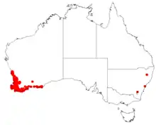 A widespread coastal and inland species from Eneabba to Augusta and in the east to Esperance. Grows in heath and scrubland on sand, gravelly clay and laterite. A hardy ornamental species which is tolerant of moderate frost and a good understory shrub.[2][3]