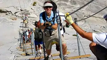 The Half Dome Cable Route hike runs from the valley floor to the top of the dome in 8.2 mi (13 km) (via the Mist Trail), with 4,800 ft (1,460 m) of elevation gain. The length and difficulty of the trail used to keep it less crowded than other park trails, but in recent years the trail traffic has grown to as many as 800 people a day.[7] The hike can be done from the valley floor in a single long day, but many people break it up by camping overnight in Little Yosemite Valley. The trail climbs past Vernal Fall and Nevada Fall, then continues into Little Yosemite Valley, then north to the base of the northeast ridge of Half Dome itself.