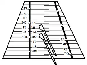 The strings of the hammered dulcimer are often tuned according to a circle of fifths pattern.[3][4] Typically, the lowest note (often a G or D) is struck at the lower right-hand of the instrument, just to the left of the right-hand (bass) bridge. As a player strikes the courses above in sequence, they ascend following a repeating sequence of two whole steps and a half step. With this tuning, a diatonic scale is broken into two tetrachords, or groups of four notes. For example, on an instrument with D as the lowest note, the D major scale is played starting in the lower-right corner and ascending the bass bridge: D – E – F♯ – G. This is the lower tetrachord of the D major scale. At this point the player returns to the bottom of the instrument and shifts to the treble strings to the right of the treble bridge to play the higher tetrachord: A – B – C♯ – D. The player can continue up the scale on the right side of the treble bridge with E – F♯ – G – A – B, but the next note will be C, not C♯, so he or she must switch to the left side of the treble bridge (and closer to the player) to continue the D major scale. See the drawing on the left above, in which "DO" would correspond to D (see Movable do solfège).