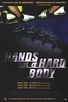 The documentary follows the 1995 competition which lasted for seventy-seven continuous hours. The film garnered the audience award for best documentary at the 1997 Los Angeles Film Festival. Filmmaker Quentin Tarantino referred to Hands on a Hard Body as one of his go-to movie recommendations. [1]