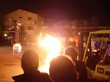 During the summer of 1959, Red Grooms along with others (Yvonne Andersen, Bill Barrell, Sylvia Small and Dominic Falcone) staged the non-narrative "play" Walking Man, which began with construction sounds, such as sawing. Grooms recalls, "The curtains were opened by me, playing a fireman wearing a simple costume of white pants and T-shirt with a poncholike cloak and a Smokey Stoverish fireman's helmet. Bill, the 'star' in a tall hat and black overcoat, walked back and forth across the stage with great wooden gestures. Yvonne sat on the floor by a suspended fire engine. She was a blind woman with tin-foil covered glasses and cup. Sylvia played a radio and pulled on hanging junk. For the finale, I hid behind a false door and shouted pop code words. Then the cast did a wild run around and it ended".[20] Dubbing his 148 Delancey Street studio The Delancey Street Museum, Grooms staged three more happenings there, A Garden, The Burning Building and The Magic Trainride (originally titled Fireman's Dream). No wonder Kaprow called Grooms "a Charlie Chaplin forever dreaming about fire".[20] On the opening night of The Burning Building, Bob Thompson solicited an audience member for a light, since none of the cast had one, and this gesture of spontaneous theater recurred in eight subsequent performances.[20] The Japanese artist Yayoi Kusama staged nude happenings during the late '60s in New York City.[21][22]