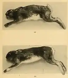 Normally a shy animal, the European brown hare changes its behavior in spring, when they can be seen in daytime chasing one another. This appears to be competition between males to attain dominance for breeding. During this spring frenzy, animals of both sexes can be seen "boxing", one hare striking another with its paws. This behavior gives rise to the idiom mad as a March hare.[5] This is present not only in intermale competition, but also among females toward males to prevent copulation.[6][7]