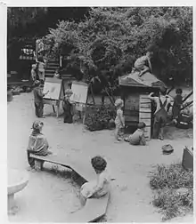 The Jones CSC preschool has an outdoor play area that is accessible virtually all day long via sliding doors and partially protected by an overhead canopy. Catherine Landreth, a former director of the school and designer of the building, worked with Joseph Esherick to create a space where the development of children would be highlighted. This included the careful planning of ceiling heights and placement of activity centers. In most other preschools, the ceilings tend to be low which emphasizes the height of adults in relation to children. Esherick and Landreth believed that a higher ceiling would shift the observers' focus from the height differential of the people occupying the space to the activities taking place. The activity centers were constructed to keep the children engaged by placing items at the child's eye level.[5] Landreth wanted a place that did not impose learning but encouraged them to engage in activities that interests the child.[6] According to a study on the physical environment for a child's development, crowding might be linked to psychological distress among children.[7] The guiding philosophy behind the preschool is that a child's environment can positively affect development.[8]