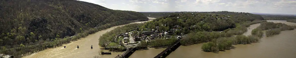 ![]() Panoramic view of Harpers Ferry from Maryland Heights, with the Shenandoah (left) and Potomac (right) rivers. | |