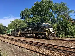 ![]() Eastbound Norfolk Southern intermodal train on the Harrisburg Line in Valley Forge, Pennsylvania; train traveling on Harrisburg Line's Reading Company main line trackage. | |